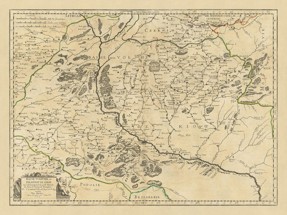 Die detaillierte Darstellung der politischen und physischen Landschaft auf der Karte basiert auf den Karten von Guillaume Levasseur de Beauplan und zeigt den kooperativen Geist der kartografischen Gemeinschaft bei der Suche nach Wissen und Erkundungen. Sansons Werk ist ein Beweis für das anhaltende Streben nach einem Verständnis der Welt in ihrer ganzen Komplexität, von der Festlegung von Grenzen bis zur Kartierung natürlicher Phänomene. Die Karte dient als Brücke zwischen Vergangenheit und Gegenwart und bietet Einblicke in die geopolitische Dynamik der Zeit und die natürliche Schönheit der Region, die durch die Kunst der Kartographie sorgfältig erfasst wurde.
