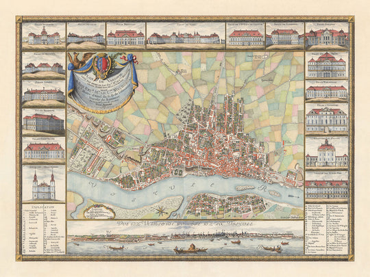 Die Karte ist mit Abbildungen wichtiger Gebäude und Bauten geschmückt und dient als historische Aufzeichnung des architektonischen Erbes Warschaus. Die detaillierten Abbildungen entlang der Grenze umfassen bemerkenswerte Wahrzeichen, die für die Identität der Stadt von zentraler Bedeutung waren. Diese visuellen Elemente steigern nicht nur die ästhetische Anziehungskraft der Karte, sondern bieten auch wertvolle Einblicke in die Architekturstile und bedeutenden Strukturen der Zeit.