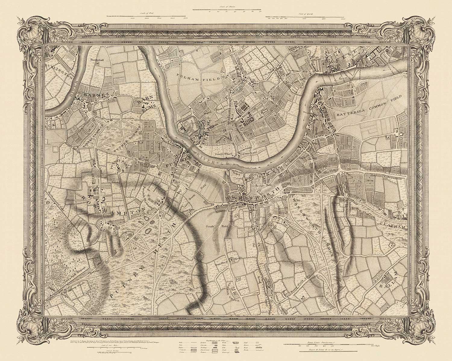 Vor fast 300 Jahren von dem Meisterkartenmacher John Rocque veröffentlicht, ist dies die erste detaillierte Karte von West-London und Südwest-London. Sie wurde ursprünglich 1746 veröffentlicht, nach einer äußerst genauen Vermessung von London und seinen Vororten, die 1740 begann. Es ist eine schöne, hochdetaillierte und äußerst seltene alte Karte.