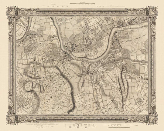 Rocque veröffentlichte zwei wichtige Karten von London. Diese Karte hier ist ein einzelnes Blatt aus einer sehr feinen 16-Blatt-Karte von "London und 10 Meilen rundherum". Seine andere Karte, eine 24-Blatt-Karte von zentral London mit prächtigem Detail, ist weitaus berühmter.