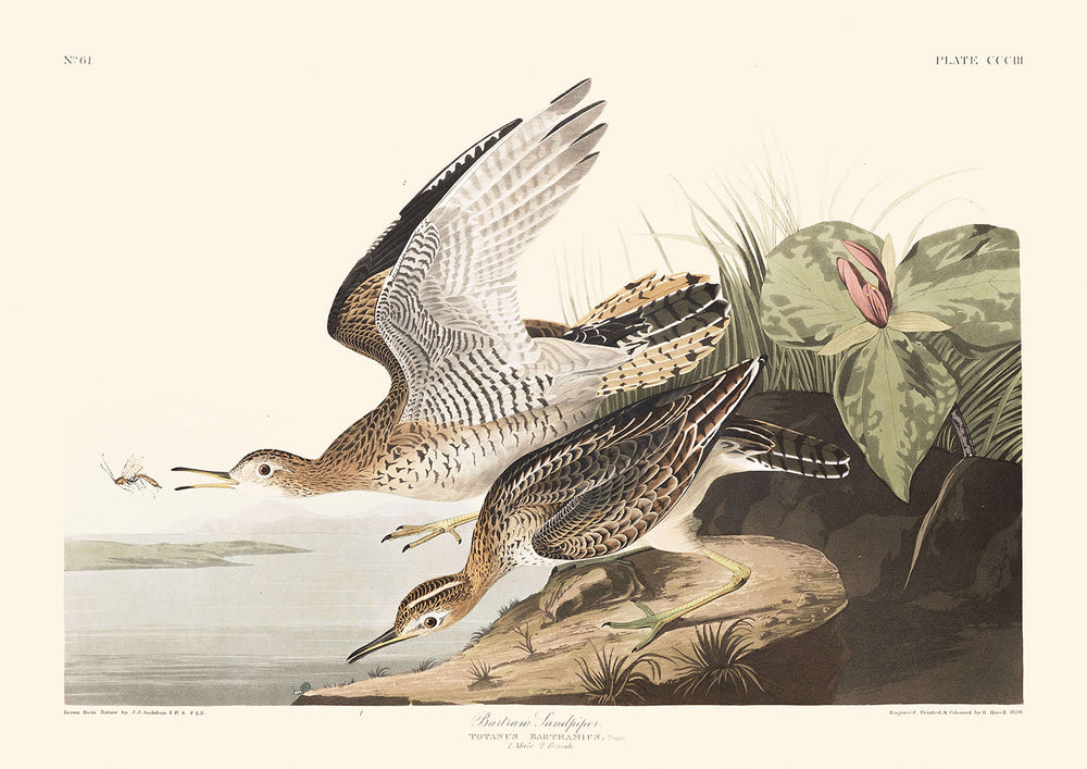Der Bartram Sandpiper, erstmals veröffentlicht im Jahr 1827, ist eine fesselnde Vogelillustration aus dem gefeierten Werk von John James Audubon, Birds of America. Dieses schöne Stück fängt die terrestrische Natur des Bartramian Sandpipers in atemberaubenden Details ein und zeigt das komplizierte Design und den lebendigen Lebensraum dieses einzigartigen Vogels.