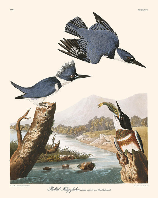 Die originalen lebensgroßen Seiten von Audubons Werk ermöglichten es ihm, immense Details in seinen Illustrationen zu vermitteln. Der Gürtelreiher (Ceryle alcyon) zeigt Audubons Fähigkeit, nicht nur das komplizierte Gefieder des Vogels, sondern auch seinen natürlichen Lebensraum darzustellen, wodurch ein Schnappschuss entsteht, der sowohl schön als auch lehrreich ist. Der Vogel ist besonders interessant aufgrund seiner einzigartigen Flugmuster und der auffälligen Färbung mit lebhaften Blau- und kontrastierenden Weißtönen.