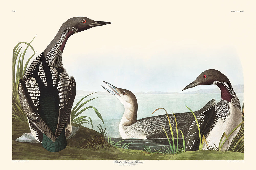 Die akribische Aufmerksamkeit des Künstlers für Details und sein Engagement für lebensechte Darstellungen sind in den komplizierten Mustern und lebendigen Farben des Schwarzhalstauchers offensichtlich. Audubons Leidenschaft für Ornithologie und Kunst findet in dieser dynamischen Darstellung ihren Höhepunkt, die nicht nur den Vogel, sondern auch sein Verhalten und seinen Lebensraum illustriert und ein immersives visuelles Erlebnis für Naturfreunde und Kunstliebhaber gleichermaßen bietet.