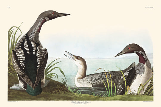 Der Schwarzhalstaucher, erstmals veröffentlicht im Jahr 1827, ist eine exquisite Vogelillustration aus John James Audubons großartiger Serie, Die Vögel Amerikas. Diese detaillierte Darstellung fängt die Schönheit und Eleganz des Schwarzhalstauchers ein, eines außergewöhnlichen Vogels, der für seine umfangreichen nordischen Wanderungen und seine zurückgezogene Brutgewohnheiten bekannt ist.
