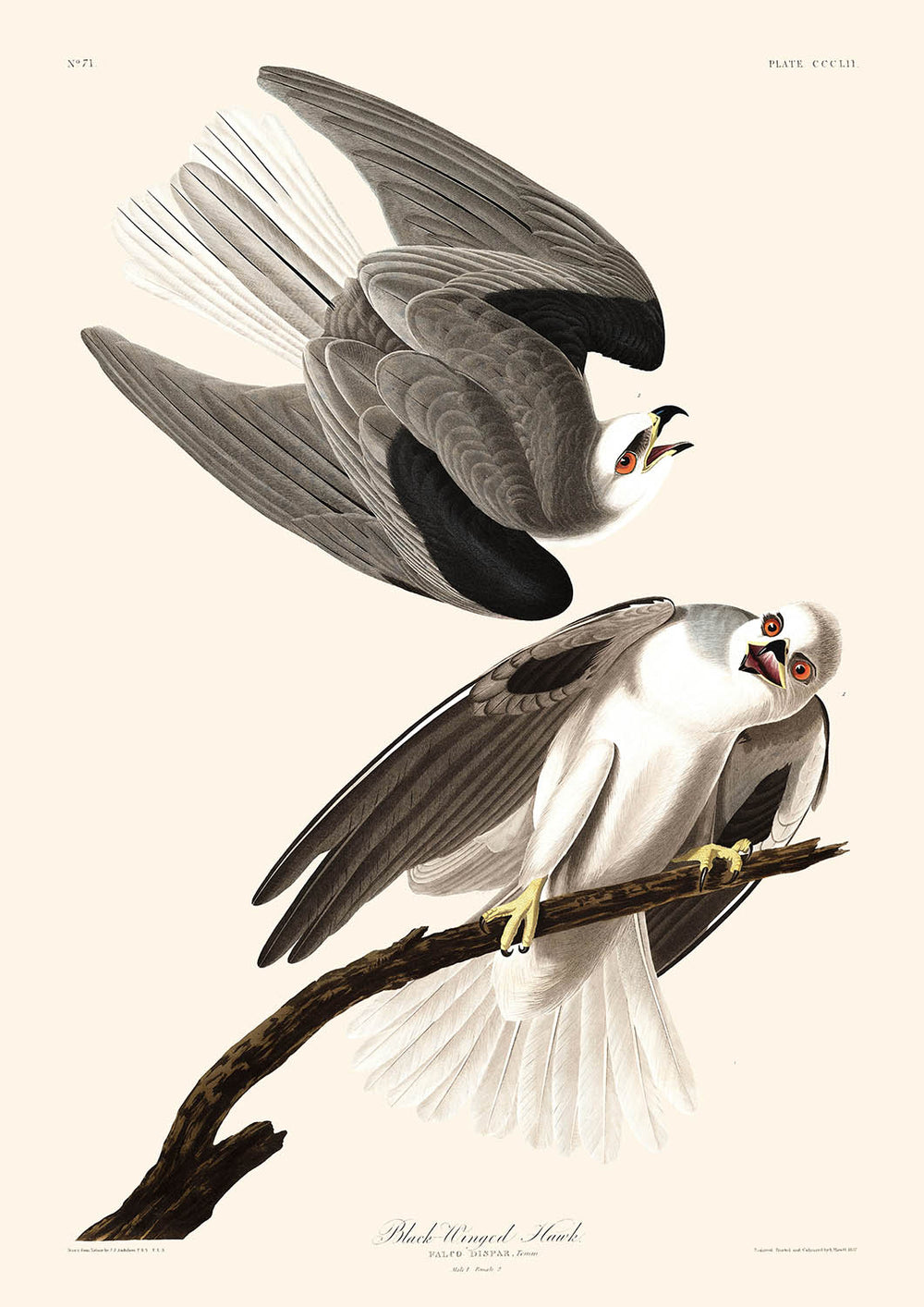 Der Schwarzflügelige Habicht, erstmals veröffentlicht im Jahr 1827, ist eine der fesselnden und dramatischen Illustrationen aus John James Audubons gefeiertem Werk, Die Vögel Amerikas. Dieses Kunstwerk fängt die rohe und majestätische Schönheit des Schwarzflügeligen Habichts in atemberaubenden Details ein.