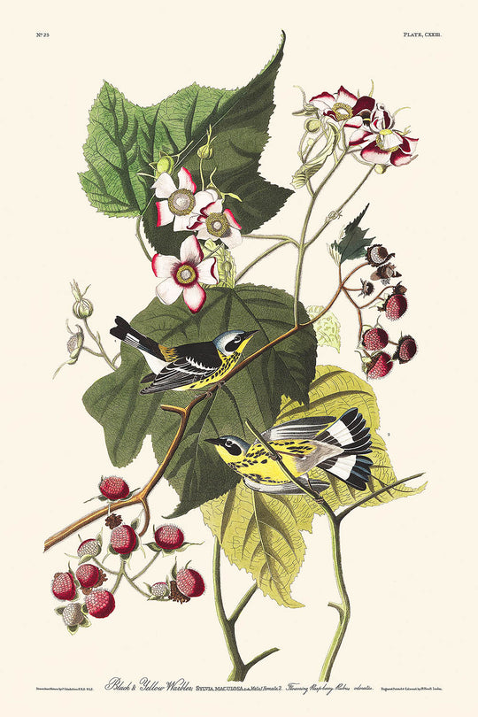 "Schwarz & Gelb Waldsänger (Tafel 123)" von John James Audubon, erstmals veröffentlicht im Jahr 1827, ist eine atemberaubend detaillierte Illustration aus Audubons legendärem Werk, Die Vögel Amerikas. Dieses fesselnde Stück zeigt zwei der lebhaftesten und schön gefiederten Waldsänger.