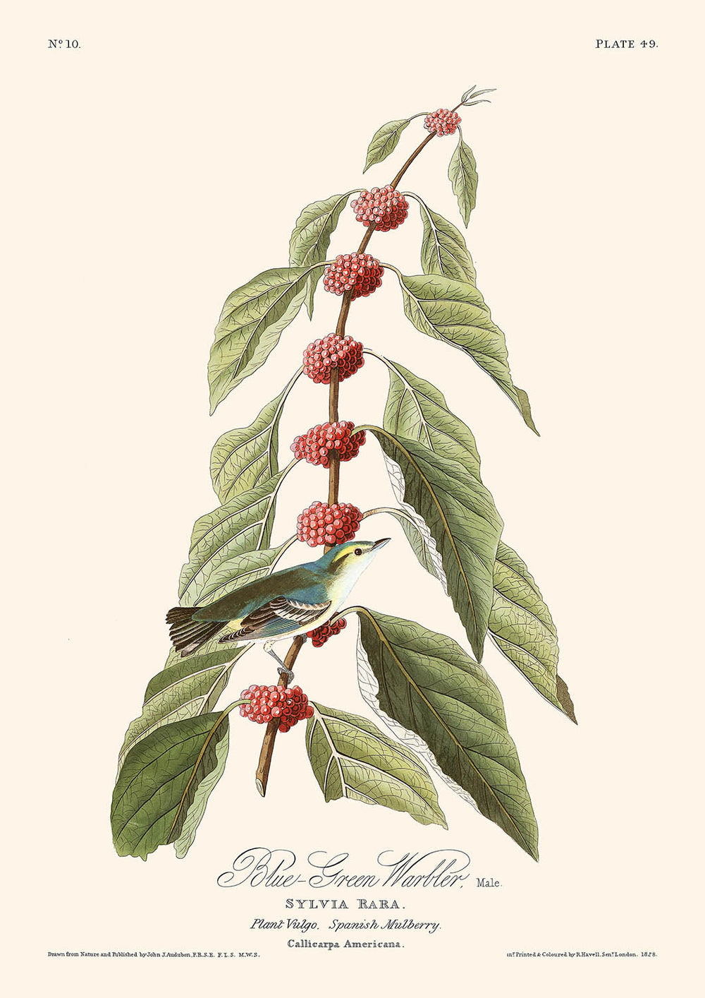 Die Seiten von "Die Vögel Amerikas" waren lebensgroß, was es Audubon ermöglichte, äußerst detaillierte Illustrationen der Vögel zu erstellen, die sie in ihrer natürlichen Umgebung mit beeindruckender Genauigkeit darstellt. Die Illustration des Blaugrünen Warblers sticht durch die lebendige Verwendung von Blau- und Grüntönen, komplexen Federdetails und einem naturalistischen Hintergrund hervor und fängt das Wesen der nordamerikanischen Wildnis ein.