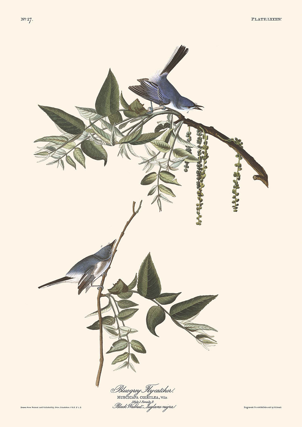 Der Blau-Graue Fliegenschnäpper ist bemerkenswert für seine Rolle als Pflegeelternteil für die Jungen des Kuhbuntings und seine agilen Flugmuster, während er nach Insekten jagt. Audubons Illustration zeigt den Vogel wunderschön zwischen den Zweigen eines schwarzen Walnussbaums und bietet einen detaillierten Hintergrund, der den Charme des Stücks verstärkt. Der Einsatz von Farbe – hellen Blautönen und sanften Grautönen – zusammen mit der kunstvollen Darstellung des Gefieders und Verhaltens des Vogels, fängt einen Moment natürlicher Eleganz und Lebhaftigkeit ein.