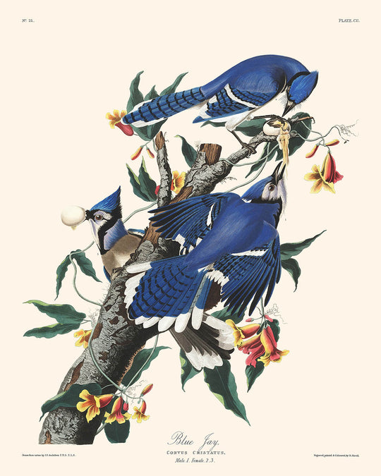 Die Illustration des "Blauen Jays" ist besonders fesselnd, nicht nur wegen ihrer ästhetischen Schönheit, sondern auch wegen ihrer erzählerischen Qualität. Audubon bietet einen faszinierenden Einblick in das komplexe Verhalten dieser Vögel und beschreibt sie als sowohl erfreulich als auch schelmisch. Der Kontrast zwischen ihrem lebhaften blauen Gefieder und ihren moralisch ambivalenten Aktivitäten macht dieses Stück sowohl visuell auffällig als auch zum Nachdenken anregend.