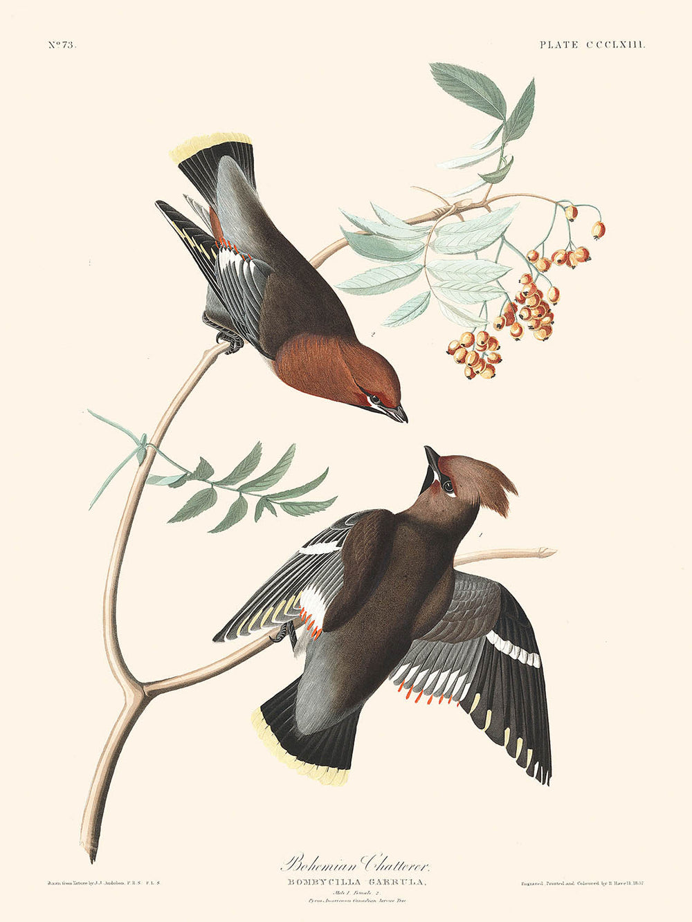 Der Bohemian Chatterer, oder Bombycilla garrula, ist bekannt für sein auffälliges Gefieder und seine einzigartigen Migrationsmuster. Audubons Darstellung ist bemerkenswert für die reichhaltige grau-braune Färbung des Vogels, die in aschgrau und braun-orange übergeht, mit hervorgehobenen Primärfedern, die in leuchtendem Gelb und roten wachsartigen Anhängseln enden. Die Szene ist ebenso informativ wie ästhetisch fesselnd und veranschaulicht die natürliche Anmut und die filigranen Details des Vogels mit Präzision.
