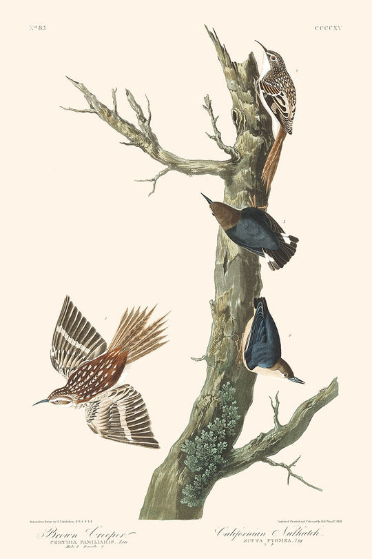 John James Audubons "Brauner Baumläufer und Kalifornischer Kleiber (Tafel 415)" ist eine fesselnde ornithologische Illustration, die erstmals 1827 im Rahmen seines monumentalen Werkes, Die Vögel Amerikas, veröffentlicht wurde. Dieses aufwendige Kunstwerk zeigt zwei charmante Vogelarten, den Braunen Baumläufer und den Kalifornischen Kleiber, die in akribischen Details festgehalten sind und Audubons Engagement für die Vogelstudien widerspiegeln.