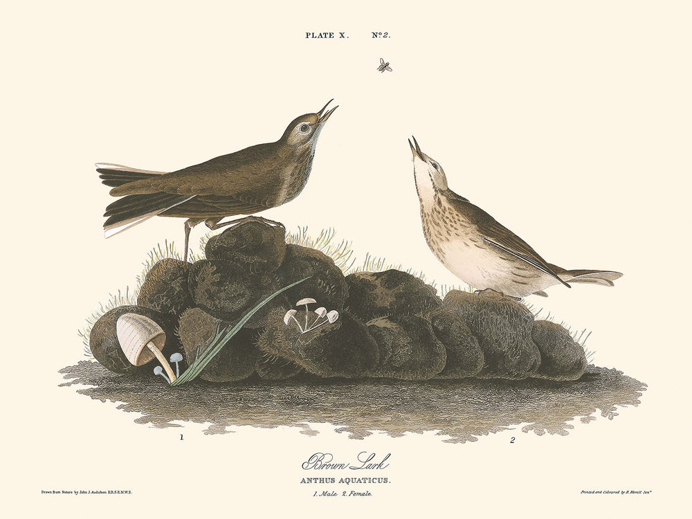 Die Seiten von Die Vögel Amerikas waren monumental – lebensgroß, um genau zu sein – was es Audubon ermöglichte, unglaublich detaillierte Illustrationen der Vögel zu erstellen, die vor kunstvoll gestalteten Landschaften gesetzt sind. Diese Illustration des Braunen Lärchens ist keine Ausnahme und zeigt feine Striche und eine auffällige Farbpalette, die dem Vogel Leben einhaucht.