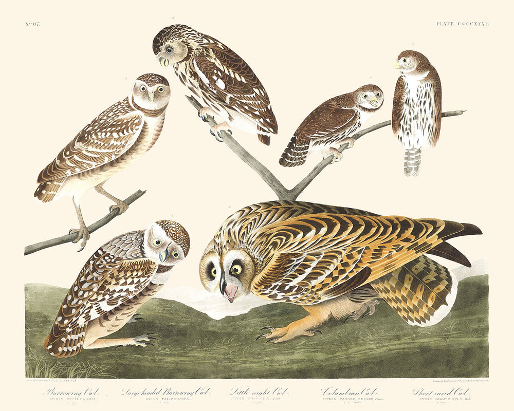Eulen mit Grabungsgewohnheiten, Großkopf-Eule, Kleine Nacht-Eule, Kolumbianische Eule, Kurzohreule von John James Audubon, 1827