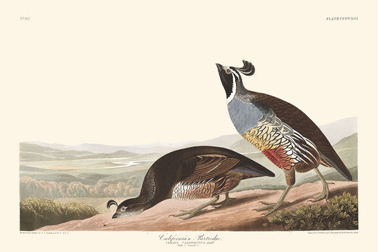 Die Illustration des Kalifornischen Rebhuhns ist besonders bemerkenswert für ihre Einbeziehung in die Dokumentation der während der misslungenen Expedition von La Pérouse gefundenen Arten. Audubons Engagement wird durch die atemberaubenden Details und reichen, lebendigen Farbtöne des Rebhuhns deutlich, die eine dynamische und lebensechte Darstellung schaffen. Sein sorgfältiger Einsatz von Farbe und Form ermöglicht es dem Betrachter, das komplizierte Gefieder und die einzigartige Haltung des Vogels zu schätzen.