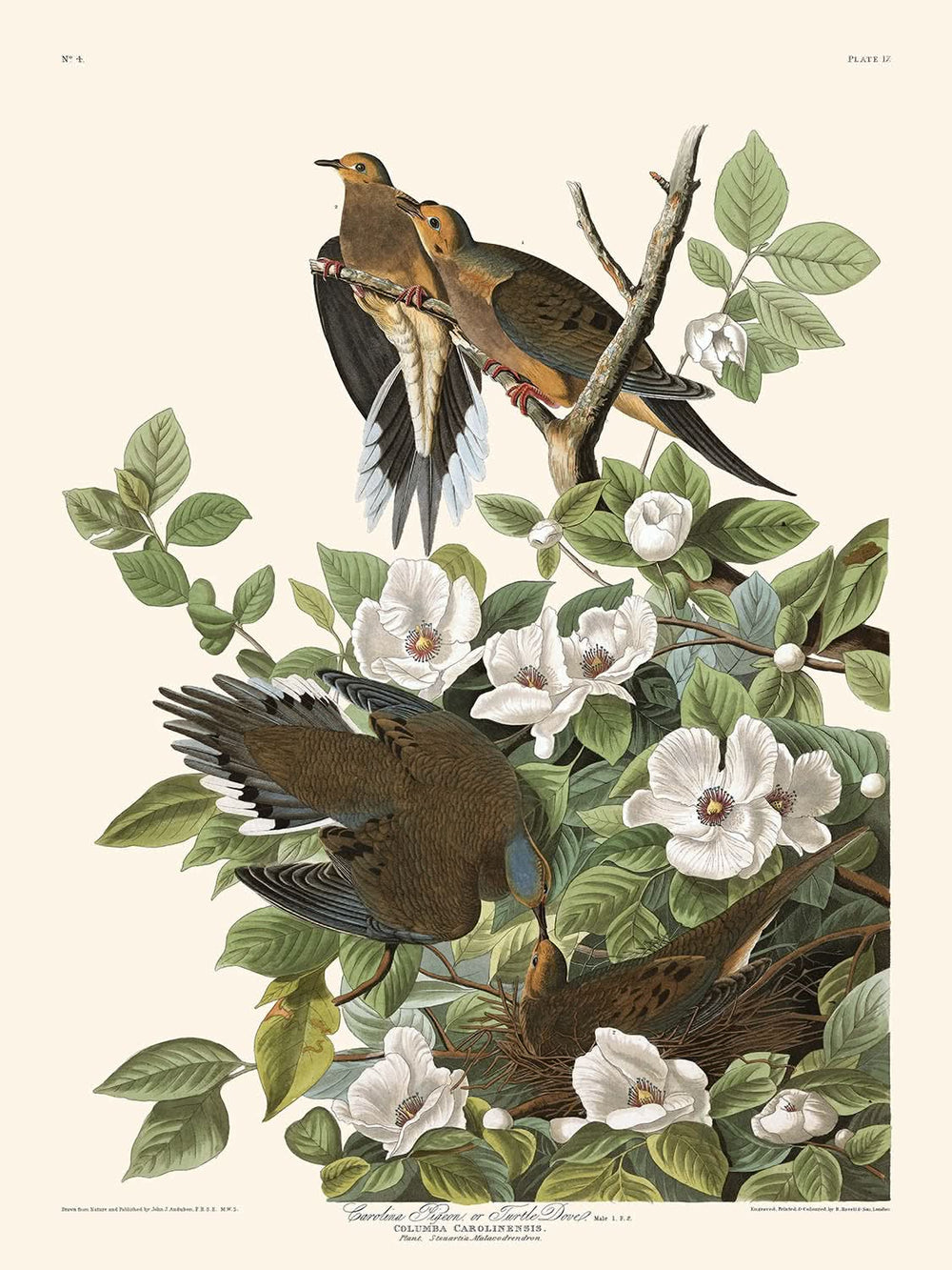 Was die Carolina-Taube besonders bemerkenswert macht, ist Audubons Fähigkeit, die sanfte Intimität der Natur darzustellen. Seine Erzählung begleitet die Illustration und beschreibt die harmonische Szene eines engagierten Paares von Tauben in der Umarmung der Natur – die Stuartia-Blüten, die für Reinheit stehen, fügen eine zusätzliche Schönheitsschicht hinzu.
