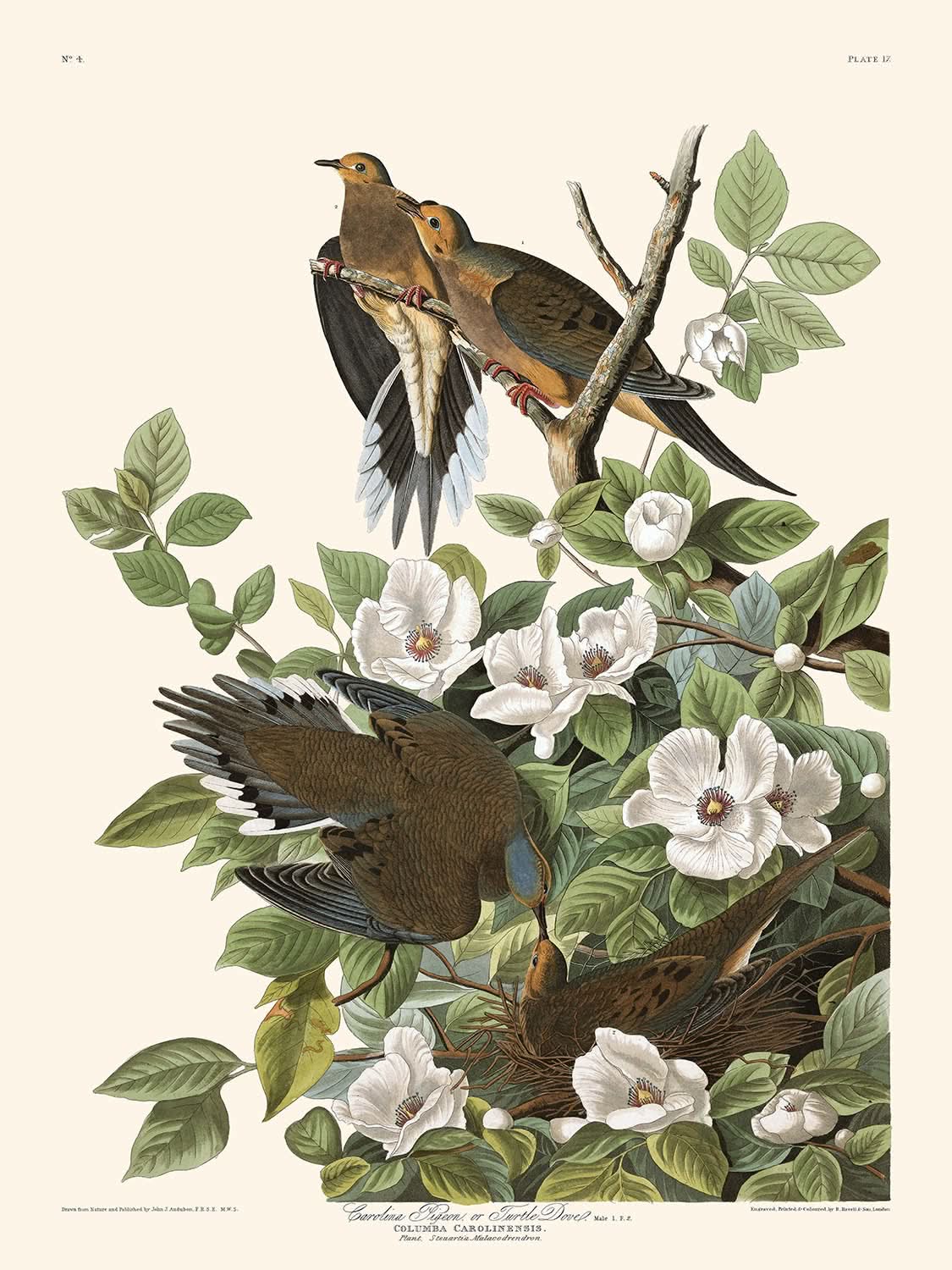Audubons Einsatz von Farbe und Detailgenauigkeit in der Carolina-Taube sind wahrhaft fesselnd. Die faszinierenden Farbtöne der Vögel, kontrastiert mit den zarten weißen Blumen und dem lebhaften Grün, schaffen ein Tableau, das sowohl ästhetisch ansprechend als auch wissenschaftlich präzise ist. Dieser Druck wäre ein geschätzter Besitz für Kunstsammler und Vogelenthusiasten gleichermaßen.
