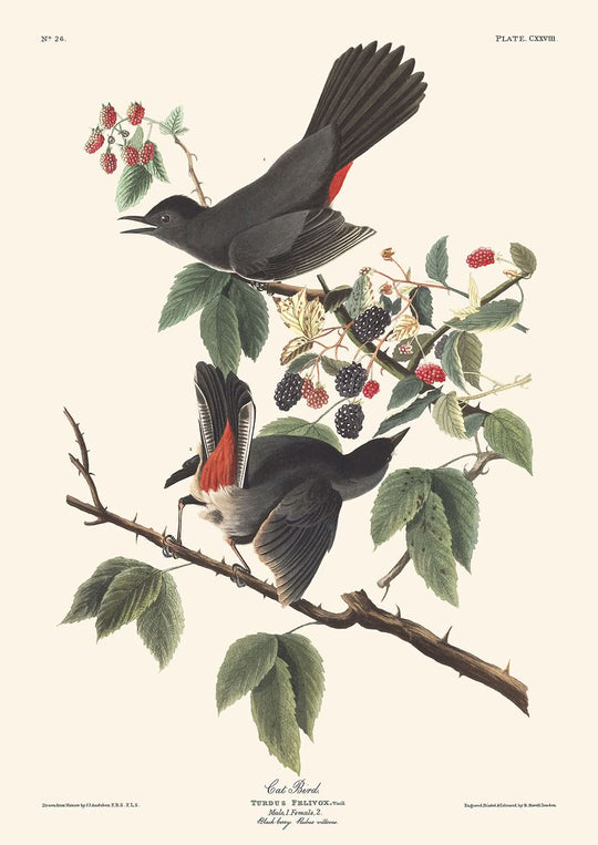 Die Illustration „Katzenvogel“ sticht in Audubons Werk durch ihre reiche Erzählung und lebendige Ausführung hervor. Der Druck spiegelt die Zugmuster des Vogels und seinen bezaubernden Gesang wider, der die Sommerluft in den Mittelstaaten erfüllt. Audubons Liebe zum Detail zeigt sich im lebensechten Gefieder und der feinen Darstellung des Vogels inmitten einer natürlichen Umgebung, die die Anmut und Eindringlichkeit seiner Melodie vermittelt.