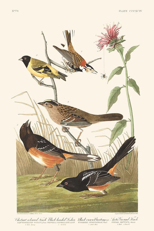 Kastanienfarbener Fink, Schwarz-köpfiger Siskin, Schwarz gekrönter Buntings, Arktischer Bodenfink von John James Audubon, 1827