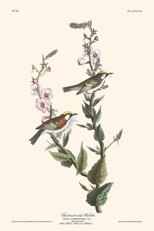 Die Platte "Rotbrust-Waldsänger" steht als bemerkenswertes Beispiel für Audubons lebendigen Stil und seine Detailgenauigkeit. Das Kunstwerk zeigt das auffällige Gefieder des Vogels mit lebhaften Gelb- und Kastanientönen vor einem zarten Hintergrund der Nachtkerze. Audubons narrative Beschreibung versetzt den Betrachter in einen seltenen Morgen in Pennsylvania und schafft eine eindringliche Verbindung zu einer schwer fassbaren Art, die Audubons Neugier und Staunen weckte.