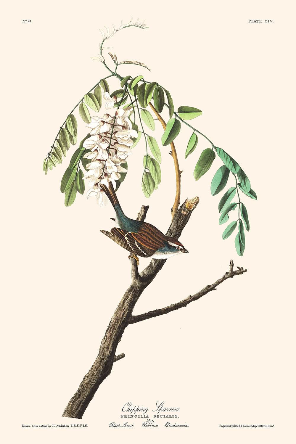 Bemerkenswerterweise hat die Illustration des Chipping Sparrow eine Bedeutung aufgrund ihrer Darstellung einer der häufigsten Vogelarten Amerikas und zeigt das Gefieder des Vogels sowie seine charakteristische Haltung mit Audubons typischer Detailgenauigkeit. Es ist ein Schnappschuss der Tierwelt des 19. Jahrhunderts und bietet einen lehrreichen Einblick in die Gewohnheiten und Lebensräume der Art, die zu dieser Zeit verbreitet waren.