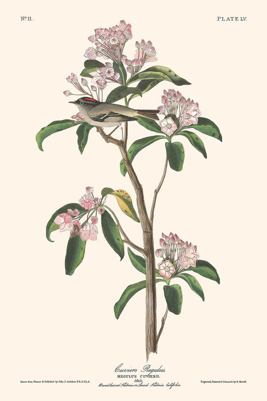 Cuvier's Kinglet sticht nicht nur durch sein avianes Subjekt hervor - zugleich zart und schwer fassbar - sondern auch durch die lebendige Farbpalette und die feinen Details, die Audubon verwendete, um diese rätselhafte Art festzuhalten. Das Stück hat historische Bedeutung und spiegelt Audubons umfassendere Errungenschaften in Kunst und Ornithologie wider.