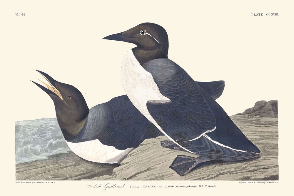 „Foolish Guillemot“, erstmals 1827 veröffentlicht, ist eine außergewöhnliche Vogelillustration aus John James Audubons berühmtem Werk „The Birds of America“. Dieses Kunstwerk fängt auf wunderbare Weise das Wesen und den Detailreichtum ein, der für Audubons beeindruckende Sammlung charakteristisch ist.