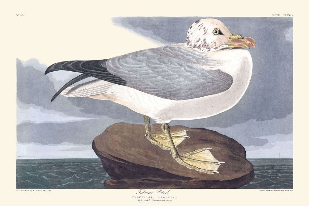 Eissturmvogel von John James Audubon, erstmals 1827 veröffentlicht, ist eine exquisite Vogelillustration aus Audubons berühmter Sammlung „Birds of America“. Diese besondere Illustration fängt die Anmut und Pracht des Eissturmvogels ein, eines Vogels, der für seinen beeindruckenden Flug und seine Widerstandsfähigkeit in schwierigen Umgebungen bewundert wird.