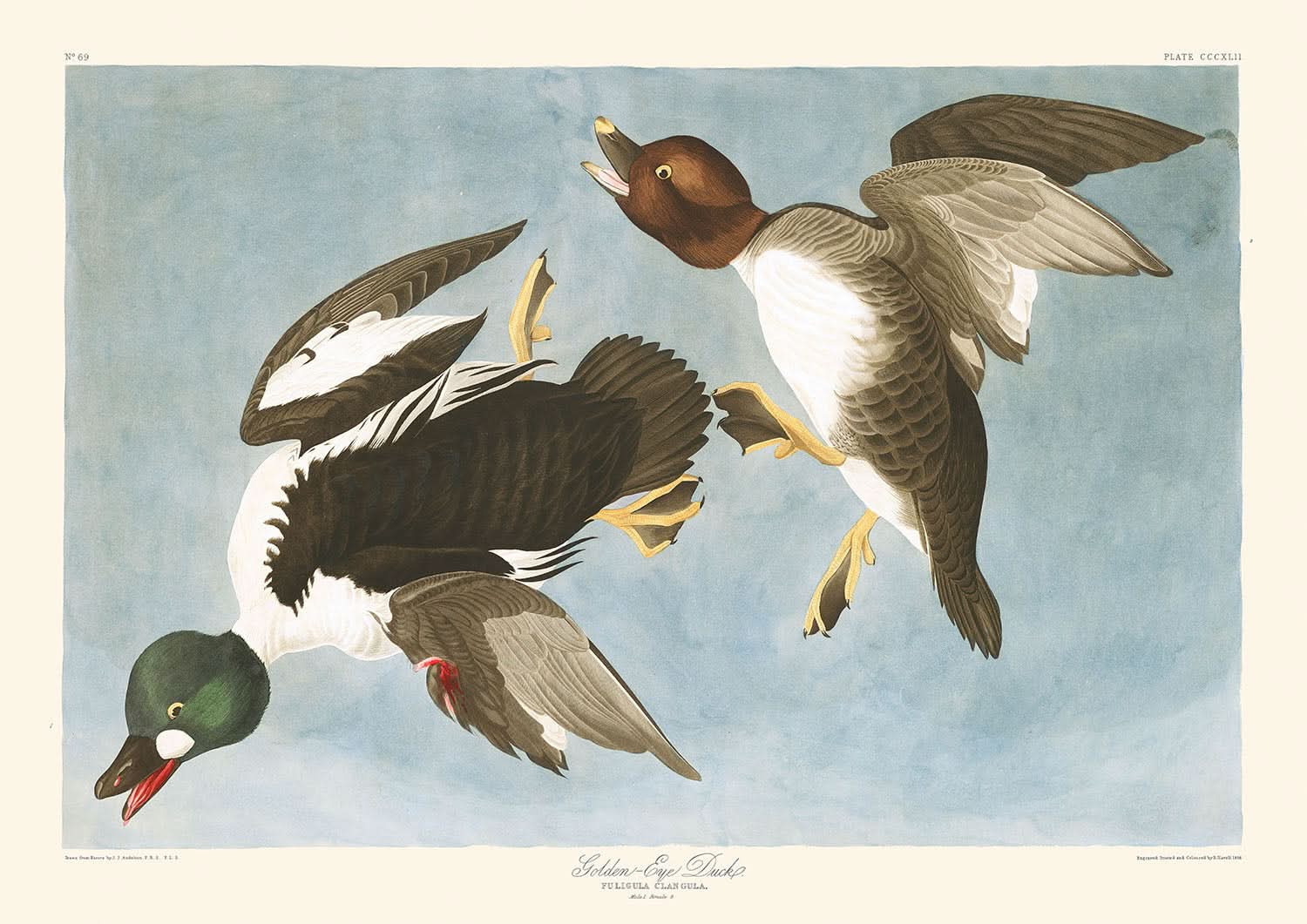 John James Audubon, ein angesehener Naturforscher und Künstler, wird für seine detaillierten und lebensechten Darstellungen von Vögeln gefeiert. Seine Serie, Die Vögel von Amerika, besteht aus 435 handkolorierten Drucken, was sie zu einem monumentalen Werk der ornithologischen Kunst macht. Audubons Illustration der Goldaugenente wird nicht nur wegen ihrer ästhetischen Anziehungskraft gefeiert, sondern auch wegen ihrer Darstellung des einzigartigen Verhaltens und der Lebensräume der Art, die selten in solch einem Detail zu sehen sind.