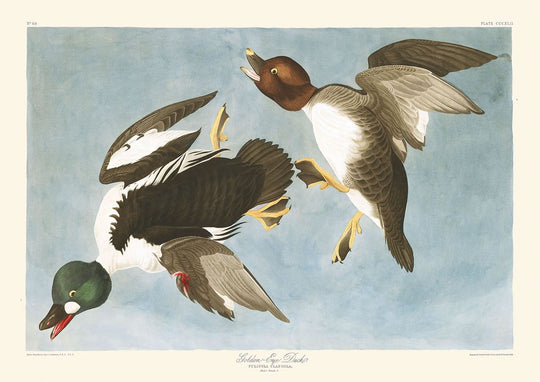 Die Goldaugenente (Tafel 342) von John James Audubon ist eine fesselnde Vogelillustration, die ursprünglich 1827 als Teil von Audubons berühmter Sammlung, Vögel von Amerika, veröffentlicht wurde. Dieses Meisterwerk hebt die renommierte Goldaugenente hervor, einen kühnen Reisenden, der für seine umfangreichen Migrationen über Nordamerika bekannt ist, von den eisigen nördlichen Breiten bis zu den weiten Buchten von Massachusetts und den Reisfeldern von South Carolina im Winter.