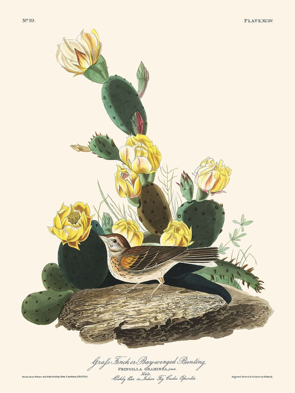 Audubons meisterhafte Verwendung von Farbe und komplizierten Details lädt die Betrachter ein, das subtile Gefieder des Grasfinks und seine lebendige Umgebung zu schätzen. Dieser Druck, ein auffälliges Beispiel für ornithologische Kunst, bringt die Ruhe der Natur in jeden Raum und ist eine wertvolle Ergänzung für jede Kunstsammlung oder Wohnkultur.