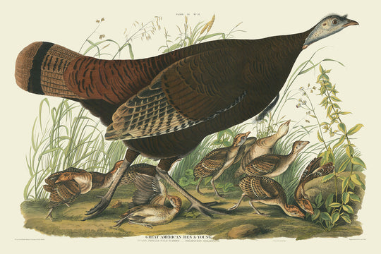 Die Große Amerikanische Henne, erstmals 1827 veröffentlicht, ist eine der fesselndsten und naturalistischsten Illustrationen aus John James Audubons berühmter Serie, Die Vögel Amerikas. Diese detaillierte Darstellung eines weiblichen Wildtruthahns (Meleagris gallopavo) und ihrer neun Küken auf einem üppigen Waldboden ist wahrhaft hypnotisierend.