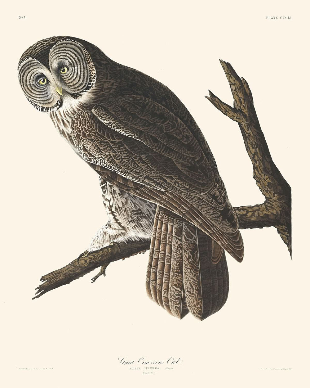 Der „Große Graue Eule“ ist nicht nur wegen seiner kühnen Größe bemerkenswert, sondern auch wegen der faszinierenden Beschreibung seiner Seltenheit und seines Verhaltens, wie sie Audubon selbst beobachtet hat. Diese Art, Strix cinerea, auch Bartkauz genannt, bewohnt die nördlichen Gebiete des Kontinents. Audubons Erzählung, gefüllt mit seinen persönlichen Begegnungen und umfangreichen Recherchen, macht diese Illustration zu einem illustrierten Manuskript ornithologischer Entdeckungen.