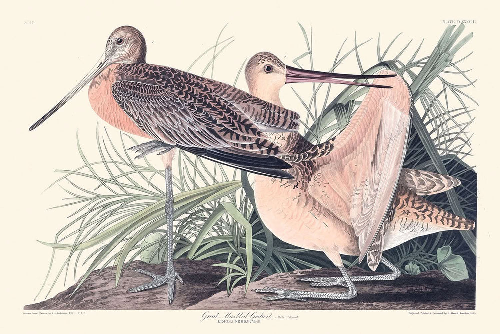 Der erstmals 1827 veröffentlichte Roman „Great Marbled Godwit“ ist eine der faszinierenden Illustrationen aus John James Audubons berühmtem Werk. Die Vögel Amerikas. Audubon ist dafür bekannt, die majestätische Vogelwelt mit beispielloser Detailliertheit darzustellen, und seine Darstellung des Großen Marmelschnepfes fängt das elegante und komplexe Gefieder des Vogels ein.