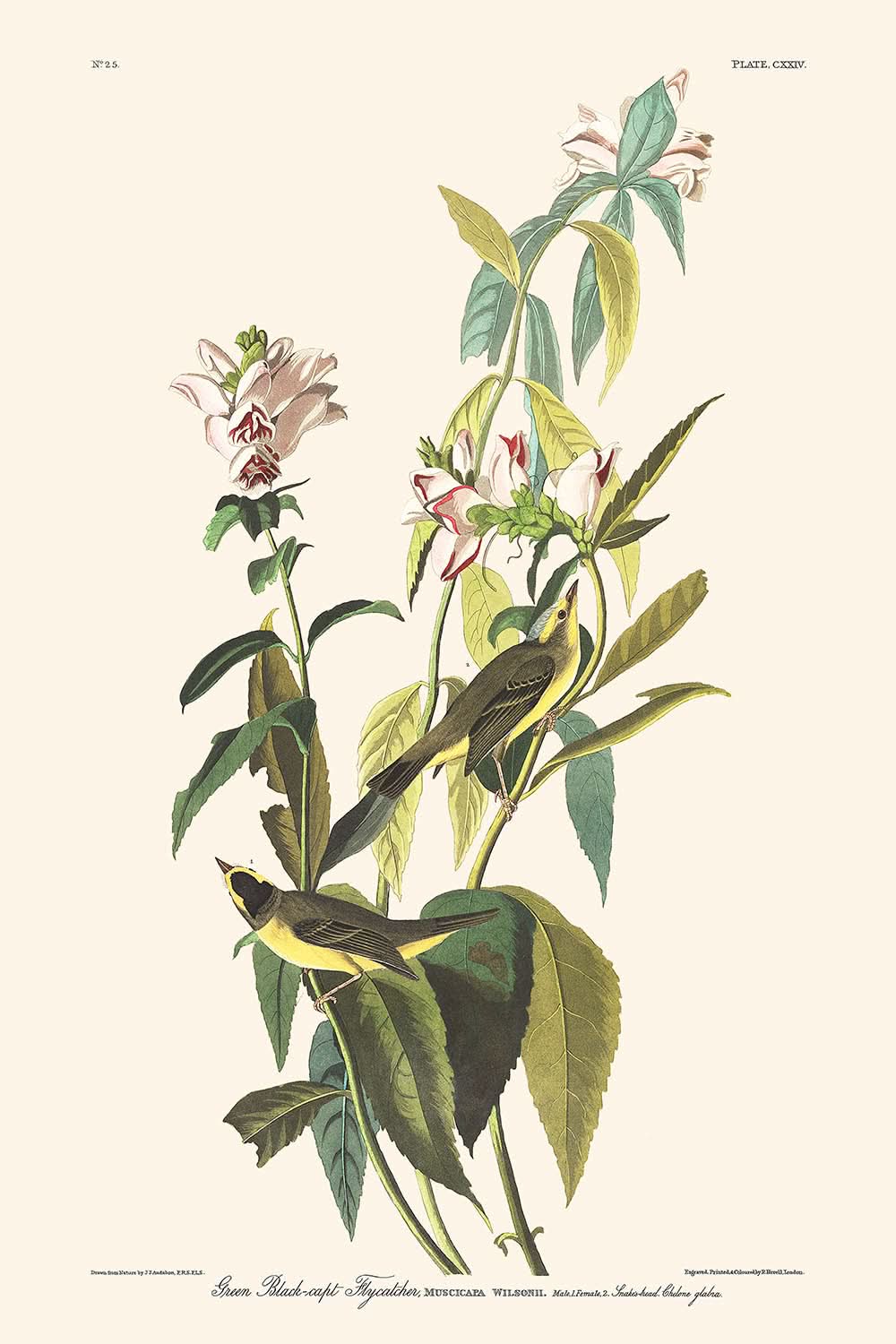 John James Audubons „Grüner Schwarzkopf-Fliegenschnäpper“ (Tafel 124), erstmals 1827 präsentiert, ist eine exquisite Illustration aus seiner berühmten Serie „Birds of America“. Diese atemberaubende Darstellung fängt die komplexe Schönheit und zarte Natur des Grünen Schwarzkopf-Fliegenschnäppers ein und zeigt Audubons beispiellose Fähigkeit, Vögel mit lebendigen Details und lebensechter Lebendigkeit darzustellen.