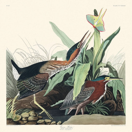 Der Grünreiher, wissenschaftlich bekannt als Ardea virescens, ist für seine leuchtenden Farben und sein einzigartiges Verhalten bekannt. Beim Betrachten dieses Kunstwerks können Sie die satten Farbtöne bewundern, die Audubon verwendet hat, vom tiefgrünen Gefieder des Vogels bis zum kontrastierenden Purpurrot an seinem Hals und dem strahlenden Gelb seines Schnabels und seiner Augen. Eine derart detaillierte Darstellung dient nicht nur ästhetischen Zwecken, sondern bietet auch Einblicke in die Biologie und Ökologie der Art.