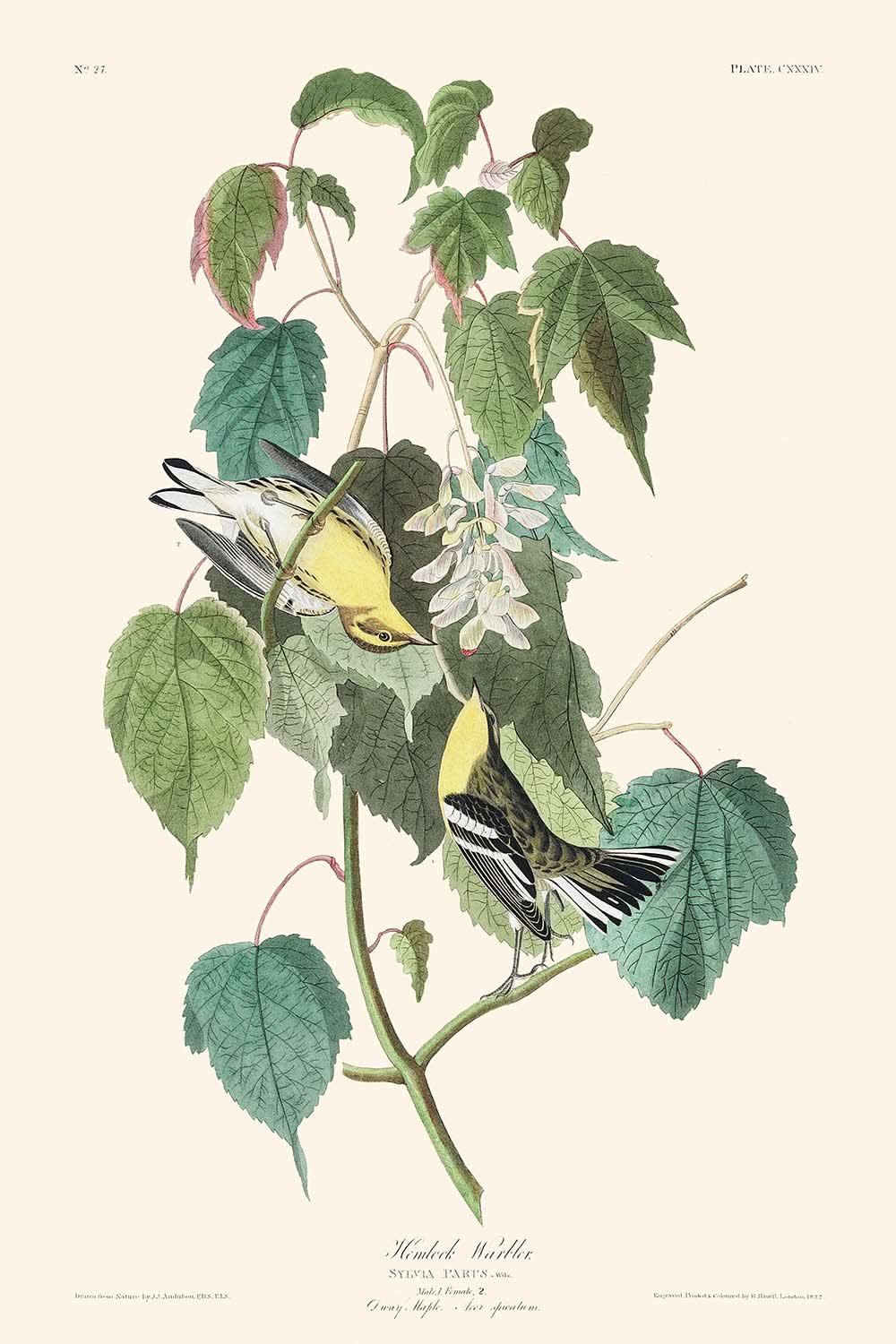 Der „Hemlock-Waldsänger“ ist besonders bemerkenswert für seinen brillanten Einsatz von Farbe und Komposition. Der leuchtend gelbe Vorderhals und die Brust des Männchens bilden einen schönen Kontrast zu den gelbgrünen oberen Teilen und den weißen Flügelspitzen und erwecken die lebhafte und bewegliche Natur dieses exquisiten Vogels zum Leben. Die Darstellung spiegelt Audubons unheimliche Fähigkeit wider, wissenschaftliche Präzision mit künstlerischer Eleganz zu verbinden, was sie zu einem außergewöhnlichen Ausstellungsstück macht.