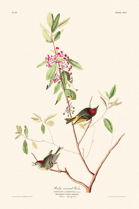 John James Audubons "Ruby Crowned Wren" (Tafel 195) fängt dieses scheue Vogel mit einem Auge für exquisite Details und lebendige Farben fesselnd ein. 1827 geschaffen, war diese Vogelillustration Teil von Audubons bahnbrechendem Werk "Vögel von Amerika", das einen neuen Standard für die künstlerische Dokumentation der Naturgeschichte setzte. Audubon war bekannt für seine Fähigkeit, den Charakter und die Persönlichkeit jedes Vogels zum Leben zu erwecken und sie in der natürlichen Umgebung darzustellen, die ihre Existenz definiert.