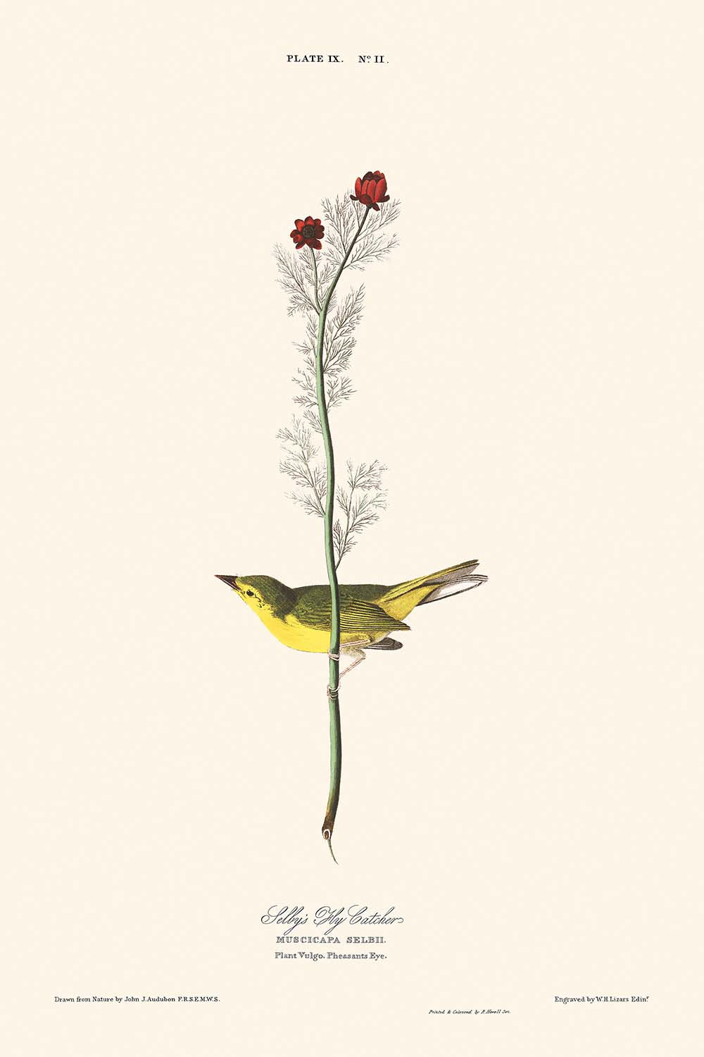 Der Reiz dieses Kunstwerks liegt in Audubons meisterhaftem Einsatz von Farbe und Komposition. In Selby's Fly Catcher ergänzen sanfte Striche in Olivgrün die kräftig kontrastierenden Gelbtöne, lebhaften Blautöne und tiefen Rottöne, die die Merkmale des Fliegenfängers beschreiben. Audubons Fähigkeit, diese Vögel auf Papier zum Leben zu erwecken, verleiht jedem Druck einen Charme, den Vogelbegeisterte und Kunstliebhaber gleichermaßen schätzen werden.