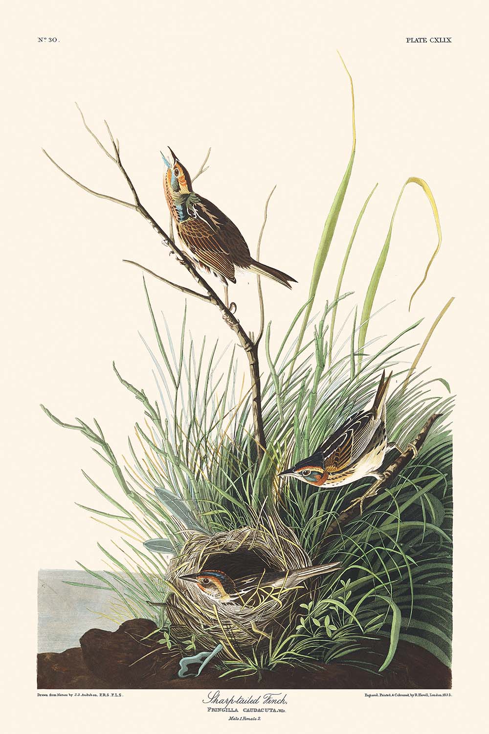 John James Audubons "Sharp-tailed Finch" aus seiner illustren Sammlung von 1827, "Vögel von Amerika," zeigt die außergewöhnliche Präzision und die tiefgehende Beobachtung eines Meisterornithologen und Künstlers. Dieses Werk hebt das komplexe Leben des Sharp-tailed Finch (Fringilla caudacuta) hervor, der während seiner jährlichen Winterreisen zu den Salzmarschen von South Carolina dargestellt wird. Die eingefangenen Feinheiten sprechen nicht nur von der zarten Anatomie des Finken, sondern auch von seinen ökologischen Verhaltensweisen, die zu Audubons Zeiten dokumentiert wurden.