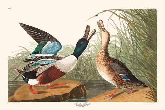 Die "Schaufelente" mit ihrer wunderbar vielfältigen Farbpalette spiegelt die intrinsische Schönheit der Art wider. Die männliche Ente, gekennzeichnet durch tiefes Grün auf ihrem Kopf, kontrastiert wunderschön mit der purpurkastanienbraunen Brust und den lebhaften karminroten Füßen, während das Weibchen eine gedämpftere, aber ebenso charmante Palette von düsteren Brauntönen und subtilen Nuancen annimmt. Diese Farben, die in dem Kunstwerk sorgfältig eingefangen wurden, dienen dazu, die visuelle Anziehungskraft zu erhöhen und bieten eine großartige Schau von Audubons Meisterschaft in Farbverlauf und Detail.