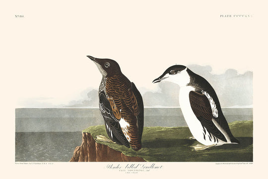 Die Schlankbillige Trottellumme hebt sich durch ihre präzise Detailgenauigkeit und eindrucksvolle Komposition hervor, die die braun-schwarzen Oberteile des Erwachsenen nahtlos mit den sanften weißen Unterteilen und grauen Akzenten verbindet. Audubon hat diese Farben geschickt eingesetzt, um einen kraftvollen Kontrast zu schaffen, der das Auge des Betrachters auf die elegante Form des Vogels und die subtilen Abstufungen in seinem Gefieder lenkt.