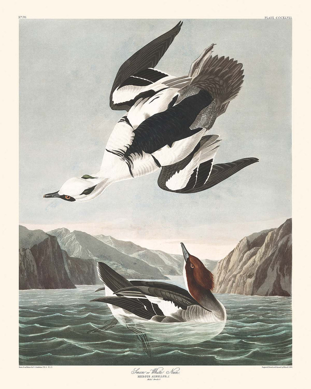 Das Kunstwerk hebt sich durch eine Farbpalette hervor, die überwiegend strahlende Weiß- und tiefschwarze Töne zeigt, durchsetzt mit Schattierungen von Entengrün und Grau, die die Vögel auf auffallend lebensechte Weise hervorheben. Audubons Liebe zum Detail zeigt sich besonders im feinen Gefieder des Smews, das mit Präzision und Vitalität dargestellt wird. Dieses Stück ist ein hervorragendes Beispiel für Audubons Fähigkeit, künstlerisches Meisterwerk mit wissenschaftlicher Illustration zu verbinden, was es zu einem Muss für Vogel- und Kunstliebhaber macht.