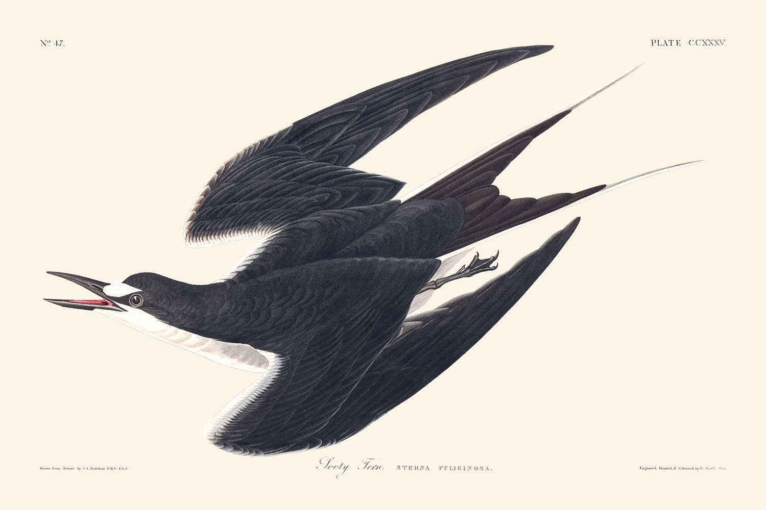 Die Sooty Tern (Tafel 235) ist eine meisterhaft gestaltete Vogelillustration des renommierten John James Audubon, die 1827 im Rahmen seiner epischen Serie "Vögel von Amerika" geschaffen wurde. Dieses Werk fängt die dynamische und anmutige Präsenz der Sooty Tern ein, einem Vogel, der für seine Eleganz und Aerodynamik bekannt ist, mit lebensechter Präzision.