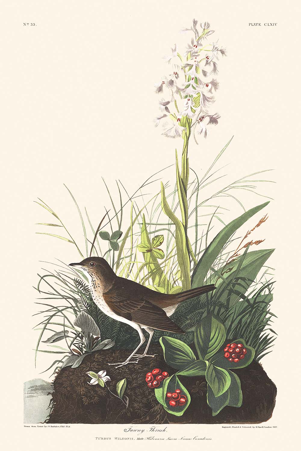 John James Audubon war ein Pionier in der ornithologischen Kunst, bekannt für seine überlebensgroßen Illustrationen. Seine Werke sind für ihre atemberaubenden Details und lebensechte Qualität gefeiert, die eine tief verwurzelte Wertschätzung für die Natur offenbaren. Die Illustration "Tawny Thrush" zeigt den Vogel Turdus mustelinus, allgemein bekannt als Wilsons Thrush oder Veery, in seiner natürlichen Umgebung mit unglaublicher Präzision.