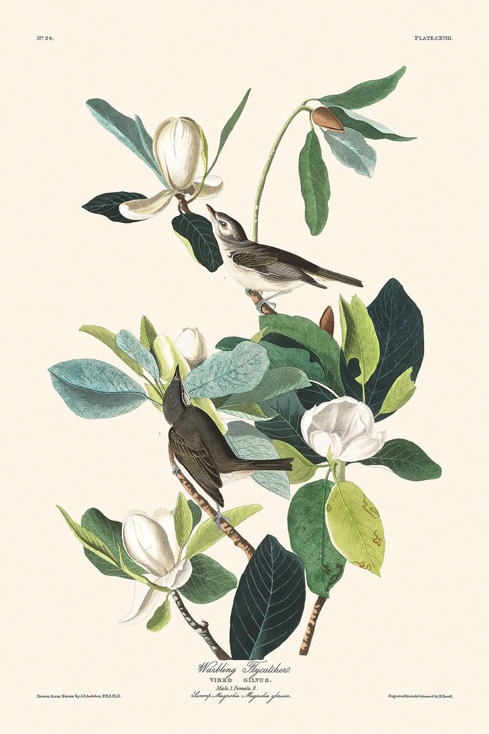 „Warbling Flycatcher“ (Tafel 118) von John James Audubon wurde erstmals 1827 als Teil der berühmten Birds of America-Reihe veröffentlicht. Diese exquisite Illustration fängt die zarte Schönheit des Warbling Flycatchers ein, der wissenschaftlich auch als Vireo gilvus bekannt ist. Sie ist ein Beweis für Audubons Fähigkeit, die komplizierten Details und den lebendigen Geist des Vogellebens darzustellen.