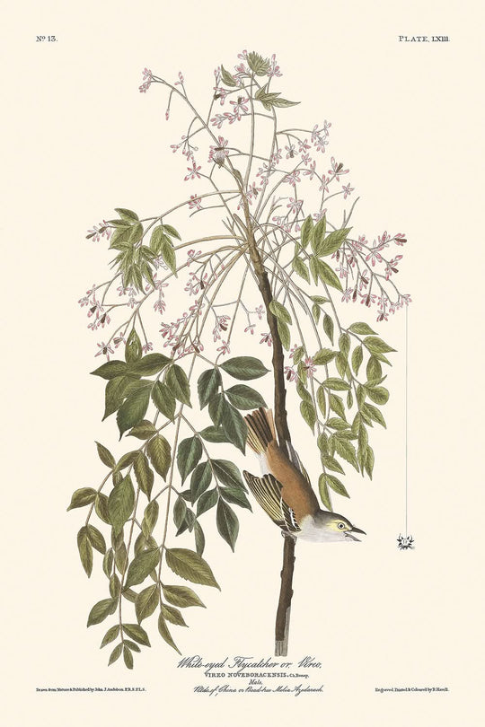 Der Weißaugen-Fliegenschnäpper oder Vireo, wissenschaftlich Vireo noveboracensis genannt, ist für seine fröhliche und dynamische Präsenz in den Vereinigten Staaten bekannt. Audubons Darstellung zeigt den Vogel mit großer Akribie, wie er auf einem Ast des Pride of China-Baums sitzt, einer Zierpflanze mit duftenden Blüten. In diesem Stück heben sich die hellen Oliv- und leuchtenden Gelbtöne vom natürlichen Grün seines Lebensraums ab, was dies zu einem idealen Kunstwerk für Vogelliebhaber und Kunstliebhaber macht.