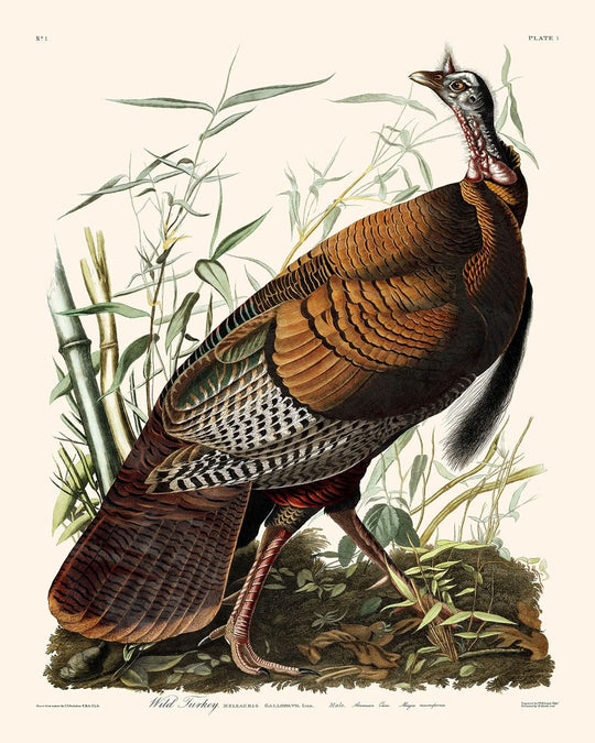 Die "Wild Turkey"-Illustration ist nicht nur bemerkenswert für ihre Darstellung der Vitalität und Schönheit des Vogels, sondern auch für ihren detaillierten Hintergrund, der die amerikanische Landschaft der damaligen Zeit widerspiegelt. Als einer der interessantesten Vögel, die in den Vereinigten Staaten heimisch sind, hebt dieser Druck das lebendige Gefieder und die Majestät des Truthahns hervor und macht ihn zu einem auffälligen Stück für jeden, der eine Wertschätzung für Wildtiere und Naturgeschichte hat.