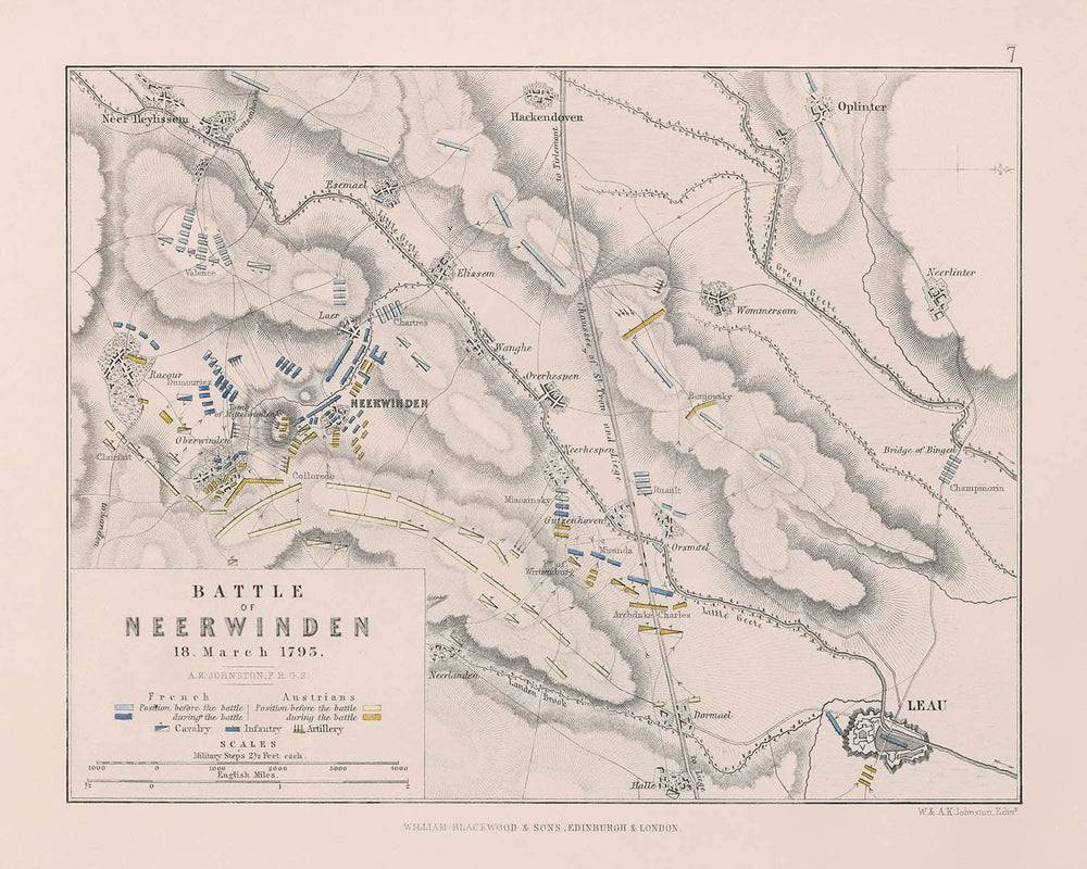 Wir stellen das faszinierende antike Kunstwerk „Schlacht bei Neerwinden, 18. März 1793“ von AK Johnston vor, das im selben Jahr wie diese bedeutende militärische Auseinandersetzung entstand. Dieser sorgfältig gravierte und handkolorierte Schlachtplan veranschaulicht anschaulich die strategischen Positionen der französischen und österreichischen Streitkräfte und zeigt Kavallerie-, Infanterie- und Artilleriebewegungen, die in der Schlacht eine entscheidende Rolle spielten. Durch die Verwendung von Schraffuren zur Darstellung des Geländereliefs bietet die Karte einen reichen historischen Wandteppich, ergänzt durch einen erklärenden Abschnitt zum besseren Verständnis. Dieses von W. & AK Johnston gravierte Stück ist Teil des „Atlas zur Begleitung von Alisons Geschichte Europas“, der die Ära von der Französischen Revolution bis zur Bourbonen-Restauration umfasst.