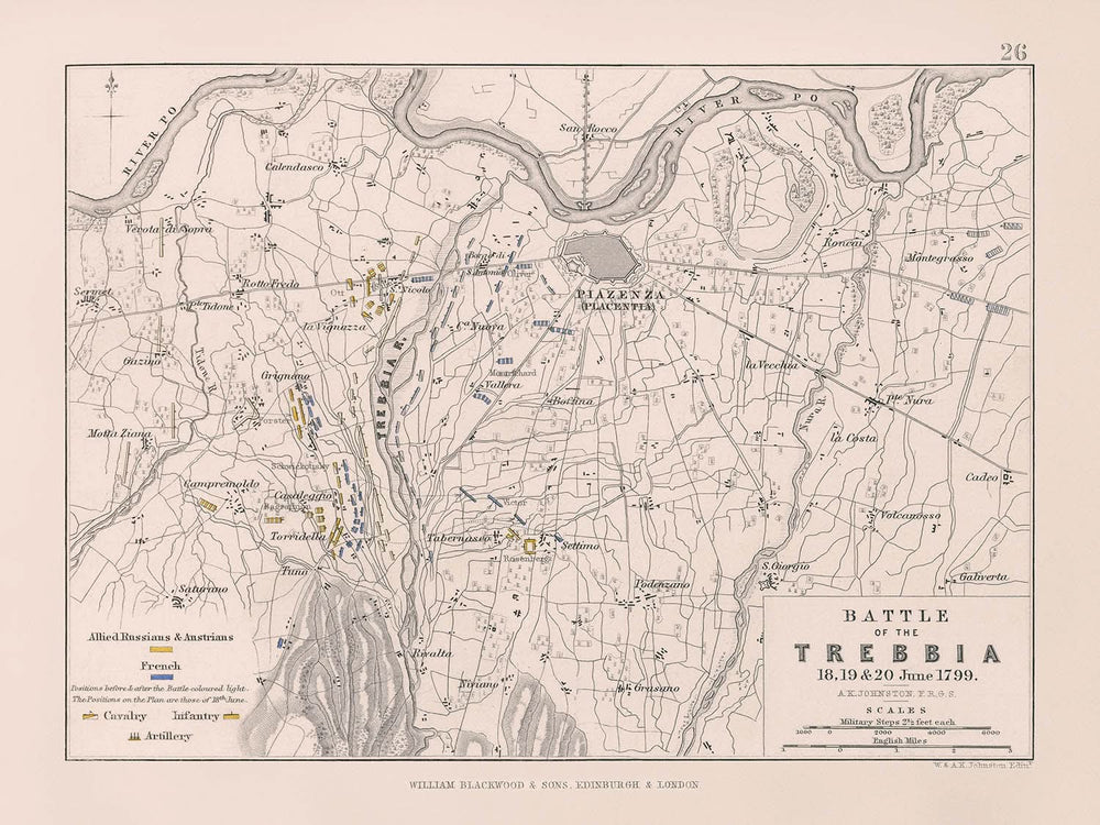 AK Johnston, dessen Werk eine Ära großartiger militärischer und geografischer Dokumentation umfasst, war für die Erstellung detaillierter und pädagogisch wertvoller Karten bekannt. Die „Schlacht von Trebbia“ ist eines jener seltenen Werke, das nicht nur geografische Genauigkeit bietet, sondern auch das Wesen der Kriegsführung des 18. Jahrhunderts mit künstlerischem Flair einfängt.