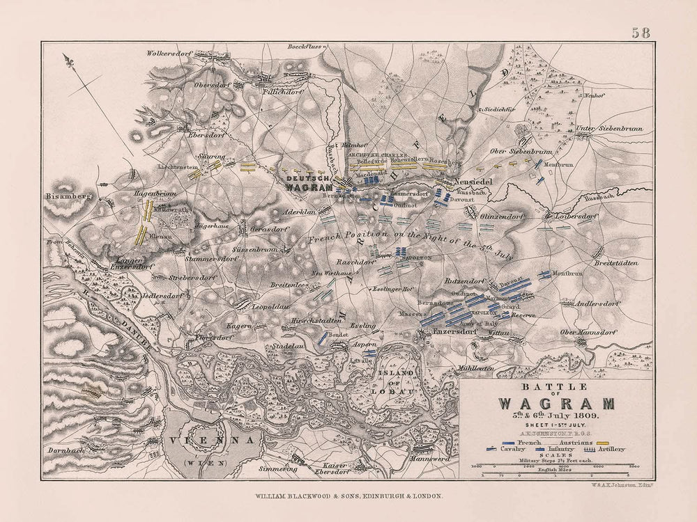 AK Johnston war im frühen 19. Jahrhundert ein wichtiger Akteur in der Kartografiekunst und veröffentlichte zahlreiche Karten und Atlanten, die für das Verständnis historischer Geografien von wesentlicher Bedeutung waren. Die Lithografie „Schlacht bei Wagram“ ist besonders bemerkenswert für ihre aufwendige Detailliertheit, die die Bewegungen der französischen und österreichischen Einheiten anschaulich rekonstruiert. Die historische Bedeutung des Kunstwerks wird durch die genaue Darstellung der militärischen Strategien, die während der Feldzüge Napoleon Bonapartes zum Einsatz kamen, noch verstärkt, da es sich mit den Komplexitäten der europäischen Geschichte des frühen 19. Jahrhunderts auseinandersetzt.